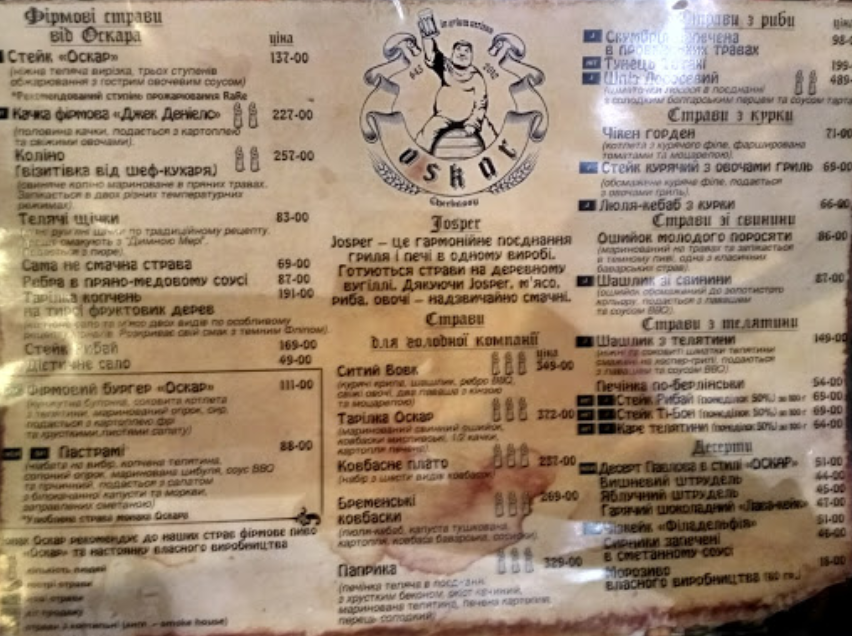 На фоне всех заведений Оскар лично мне выделяется хорошим обслуживанием, всегда свежими ингредиентами в блюдах да и в общем неизменным высоким качеством сервиса. Если я голоден и хочу мяса, то это заведение №1 в моем личном рейтинге чтобы поесть. Пиво пить не люблю, потому решайте сами на сколько эта пивоварня вам подходит, а вот за остальное меню могу только хвалить. Однозначно рекомендую для хороших компаний, но ни в коем случае не тяните сюда детей, это выглядит уж очень печально. Заведение встретит вас как всегда приветливо, но выглядеть это будет по крайней мере странно. Это все же пивоварня тут мужики смотрят футбол и едят мясо.
